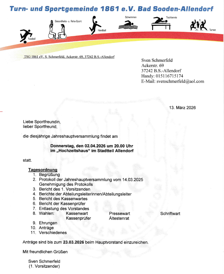 Die Jahreshauptversammlung der TSG findet am Donnerstag, den 2. April im Hochzeitshaus im Ortsteil Allendorf statt. Beginn 20.00 Uhr.